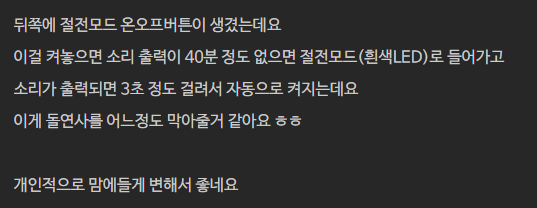 이번에 리뉴얼된 모델은 장시간 미사용시 절전모드로 들어가는 모드가 생겼다고 하는데 어느 커뮤니티 사용자는 돌연사(?) 관리를 위해 생긴 모드가 아니냐고 했다. 그걸 떠나서 절전모드 만으로 해결이 되나? 싶기도하고 이런 기능이 없이 상시 전원이면 고장나버린다는 것도 이상하고..